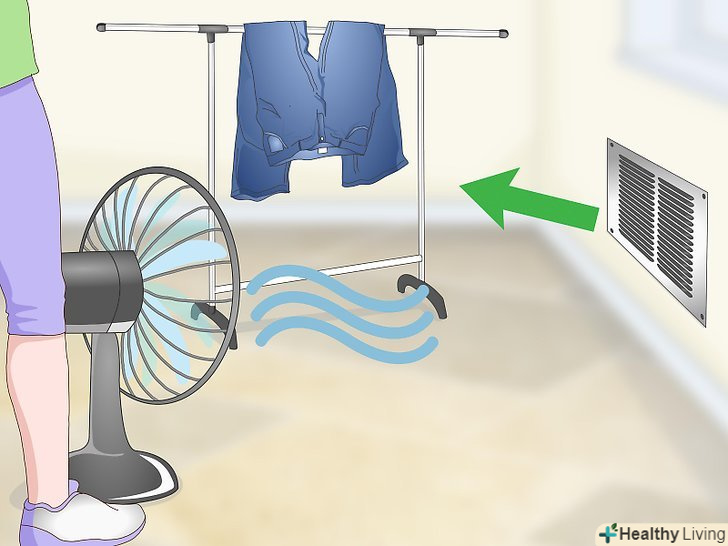 Увімкніть вентилятори і систему підігріву. природне джерело тепла і циркуляція повітря прискорять час сушіння. Увімкніть джерела тепла і подачі повітря, які знаходяться поруч. Це можуть бути вентилятори і система опалення в будинку. Завдяки теплу і повітрю одяг висохне швидше. [9]- Якщо ви живете у вологому кліматі, осушувач повітря теж прискорить процес сушіння.