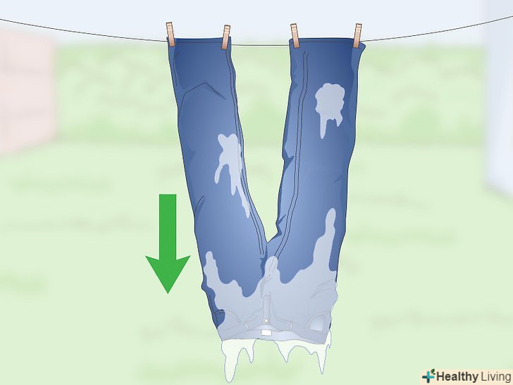 Прищіпити штани за шви, щоб вони швидше висохли. складіть штани навпіл, притиснувши штанини разом. Піднесіть нижні кромки штанин до білизняний мотузці і прищіпити їх. Якщо у вас поруч висять дві білизняні мотузки, розділіть штанини і прищіпити по одній до кожної мотузці. Це ще більше скоротить час сушіння. [6]- Оскільки талія штанів Важче, краще, щоб вона звисала вниз. Але, якщо хочете, штани можна повісити і за талію.