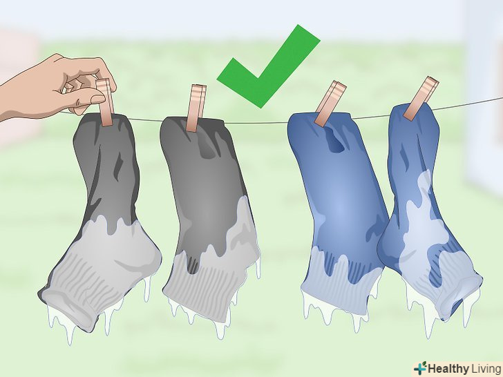 Повісьте шкарпетки попарно за миски. Тримайте шкарпетки попарно, щоб заощадити місце. Складіть шкарпетки, обернувши їх мисками за мотузку. Закріпіть одну прищіпку між шкарпетками, причепивши обидва відразу. Таким же чином поступите і з іншими парами шкарпеток, які потрібно висушити. [7]