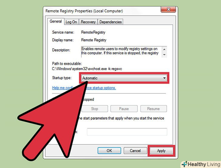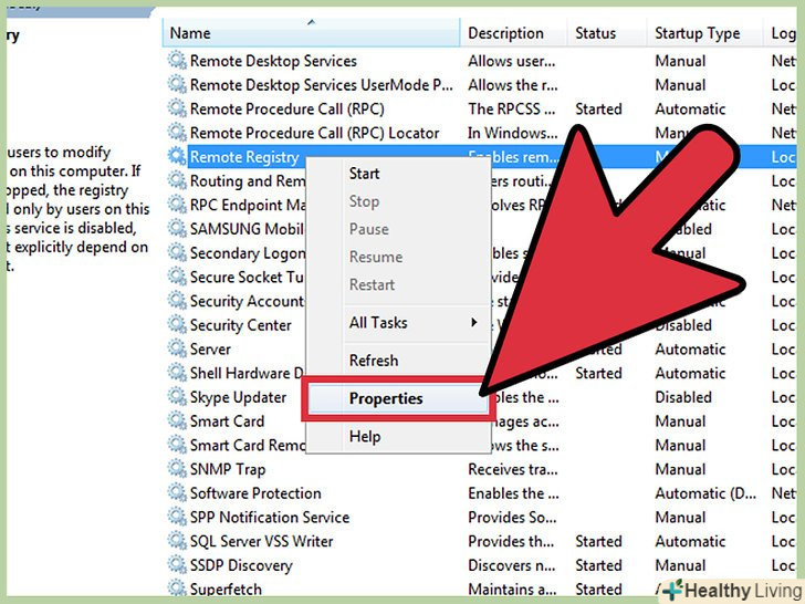 Клацніть правою кнопкою миші по "віддалений реєстр «і виберіть»Властивості". Відкриється вікно з властивостями цієї служби.