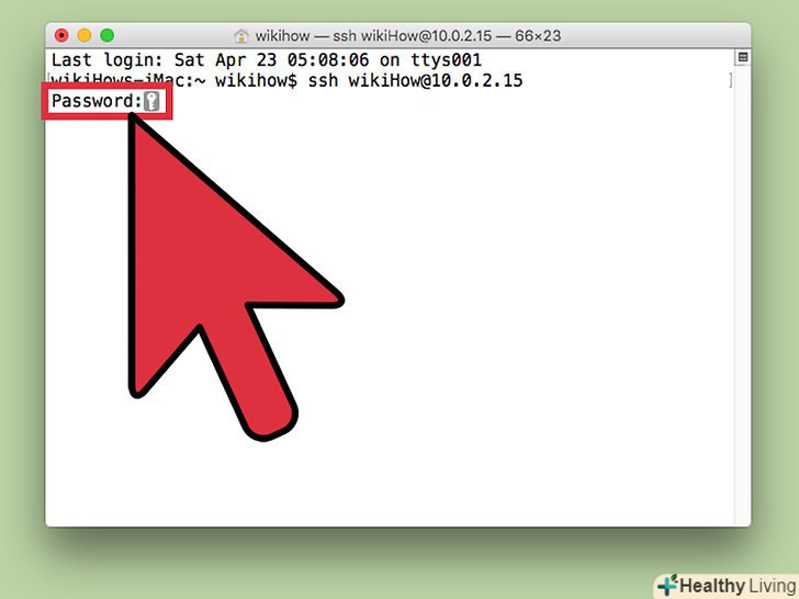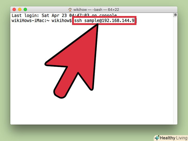 Введітьssh ім'я користувача@IP-адреса. Замініть ім'я користувача на ім'я користувача віддаленого комп'ютера, аIP-адресу — на IP-адресу віддаленого комп'ютера.- Докладніше про те, як знайти IP-адресу Комп'ютера Mac, читайте в цій статті.