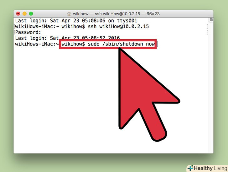 Введітьsudo /sbin/shutdown now натисніть ⏎ Return.комп'ютер Mac буде негайно вимкнений, а SSH-з'єднання з комп'ютером розірвано.- Якщо ви віддаєте перевагу перезавантажити комп'ютер, додайте-R після слова shutdown.