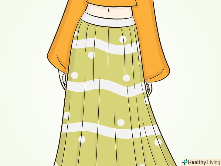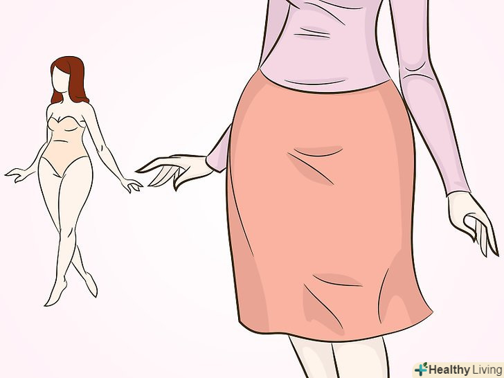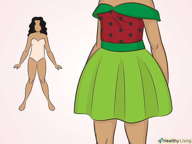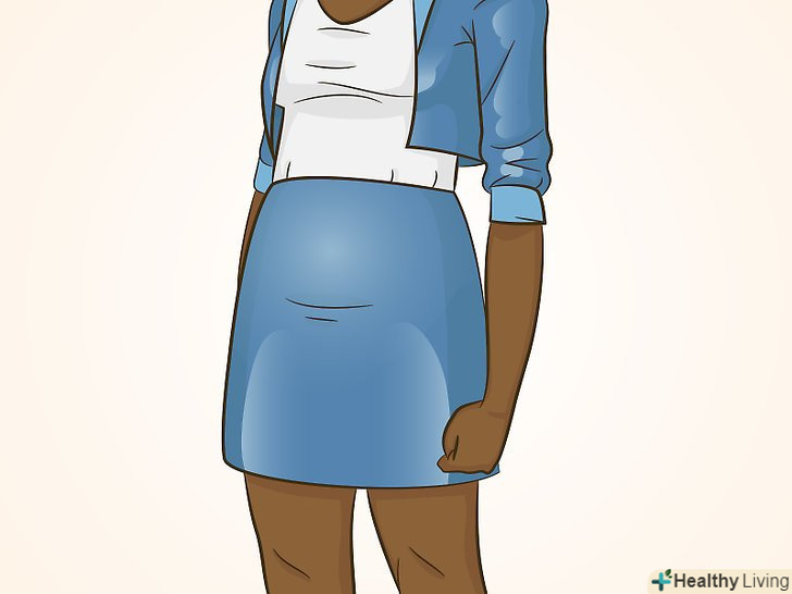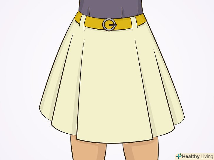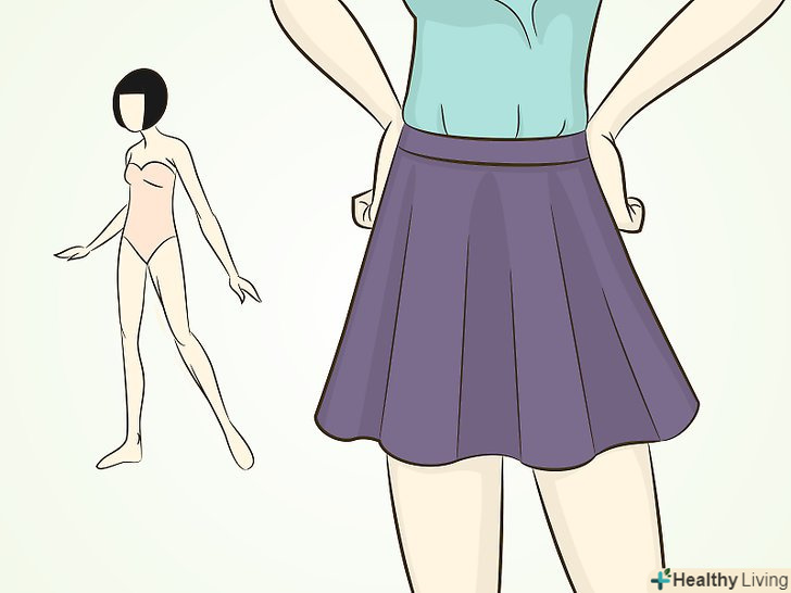 Виберіть спідницю з високою талією для типу фігури «яблуко». розкльошена донизу спідниця з високою талією і оборкою підійде найкраще. Пояс підкреслить саму вузьку частину тулуба, а оборка приховає виступаючий живіт. [4]- У жінок з такою фігурою зазвичай довгі худі ноги. Одягніть коротку спідницю з високою талією, якщо хочете зробити акцент на довжині ніг.