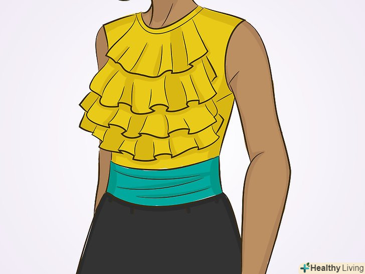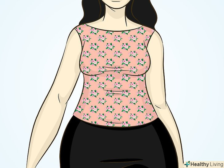 Вибирайте кольоровий верх, якщо у вас фігура у формі яблука або груші. для фігури у формі яблука або груші рекомендується врівноважувати більш струнку верхню частину тулуба з широким нижнім ділянкою тіла. Підбирайте кольоровий верх під однотонні спідниці, і це підкреслить достоїнства вашої фігури. [12]- Наприклад, спробуйте поєднувати квіткову блузку милою забарвлення з однотонною спідницею з високою талією.