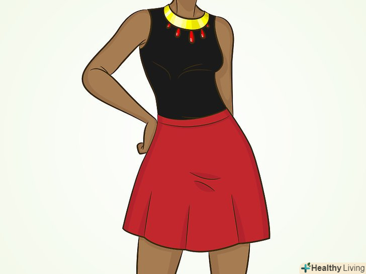 Вибирайте великі прикраси, якщо у вас вузькі стегна. для фігури з вузькими стегнами рекомендується вибирати аксесуари, які врівноважують верхню і нижню частину тулуба. Великі прикраси допоможуть створити ілюзію обсягу у верхній частині тіла. [13]- Наприклад, можна надіти намисто з великими намистинами в поєднанні з легкою спідницею-трапецією.