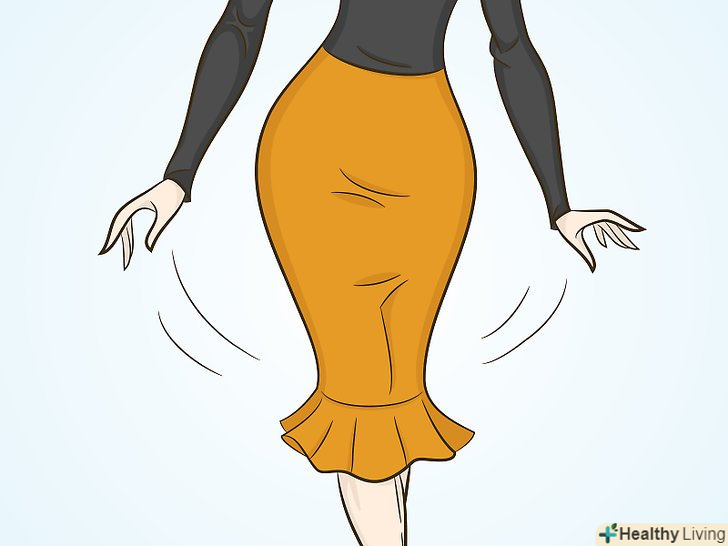Вибирайте довгу спідницю А-образного силуету для типу фігури «груша». спідниця такої форми дуже вигідно виглядає на такому типі фігури, оскільки вона підкреслює талію і краде округлі стегна. Це допоможе візуально їх зменшити. Такі спідниці прекрасно підходять для жінок з широкими стегнами, адже їх довжина маскує пишні форми нижньої частини тіла. Бажано вибирати спідниці довжиною трохи нижче колін. [3]
