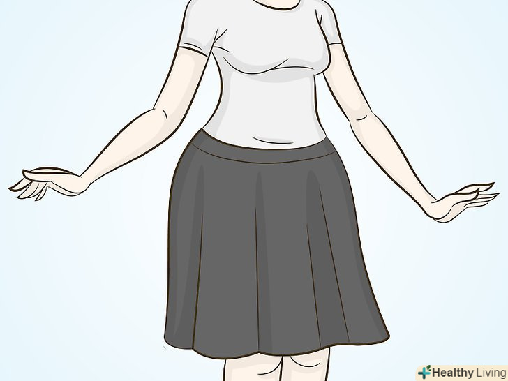 Вибирайте темні кольори для типу фігури "груша". необхідно врівноважити верхню і нижню частину тіла, якщо у вас грушоподібний тип фігури. Спідниця темного кольору допоможе в цьому, адже вона візуально робить стегна стрункішими. При такому типі фігури бажано вибирати спідниці на кілька тонів темніше верху. [10]- Наприклад, можна надіти темно-сіру складчасту спідницю А-силуету в поєднанні зі звичайною білою футболкою.