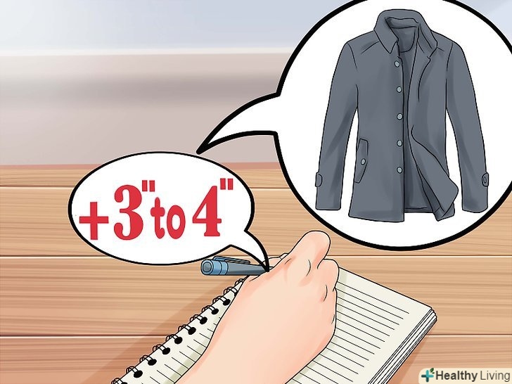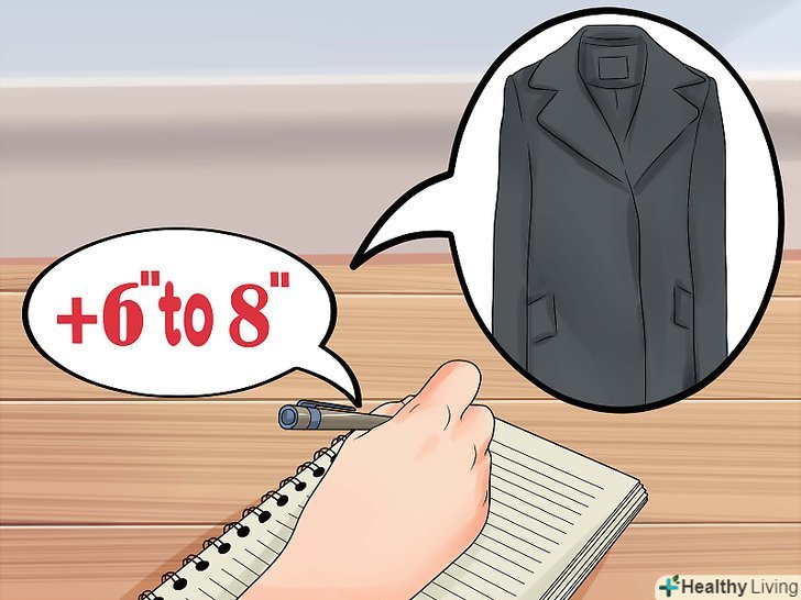 Розділіть цей вимір навпіл, щоб визначити довжину між пахвами. це еталон, який використовують багато виробників пальто. Якщо завмер грудей був 1 метр, то потрібно додати 15-20 сантиметрів і розділити суму навпіл, щоб отримати довжину між пахвами 61-64 сантиметри.