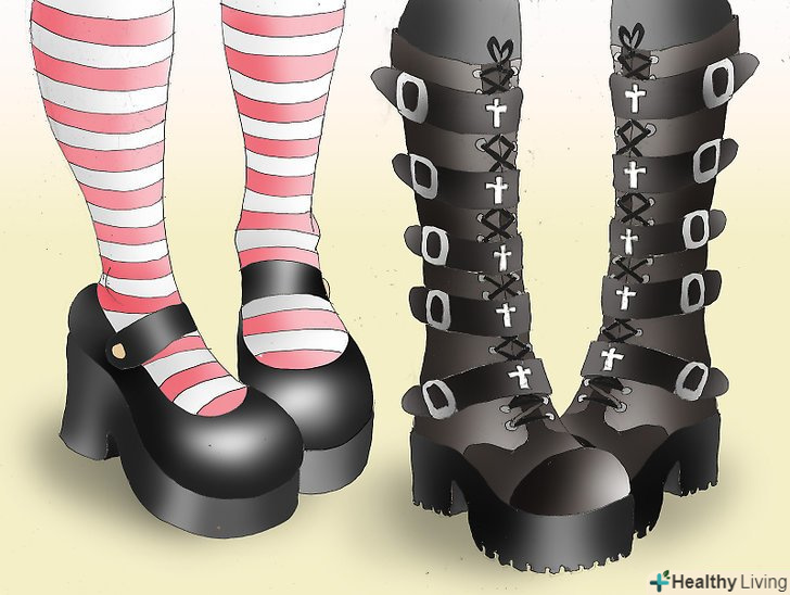 Одягніть взуття на платформі. взуття в стилі Мері Джейн - самий підходящий варіант. Подумайте про той тип взуття, який маленький дівчата надягають, збираючись на службу до церкви. Правильне взуття для стилю Лоліта повинна включати в себе закритий округлий носок, а також невеликі товсті каблуки або платформу. Також можна іноді носити балетки або туфлі-човники.- Також поширені чоботи, які підходять для образу гот - або панк-Лоліти. Ще одним хорошим типом взуття є Вів'єн Вествуд Rocking-horse Shoe в поєднанні з топом в стилі Мері Джейн. Вони, як правило, мають вигнутий носок і виріз в задній частині.