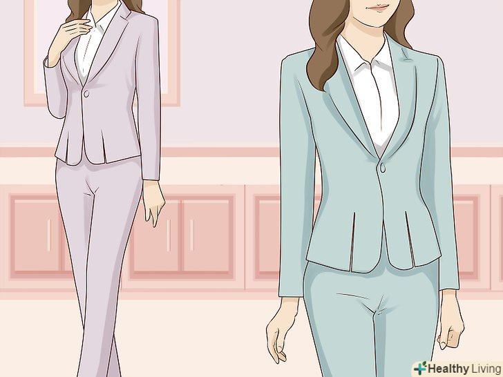 Відтворити офісний стиль 90-х можна за допомогою брючного костюма. Вам знадобляться однотонні штани і відповідний до них за кольором піджак. Саме так жінки ходили на роботу в 1990-ті. [11]- У 90-ті носили брючні костюми всіх кольорів веселки. Якщо ви любите яскраві кольори, виберіть червоний, фіолетовий або синій. Брючний костюм може бути і більш нейтрального кольору-наприклад, бежевий, хакі або коричневий.