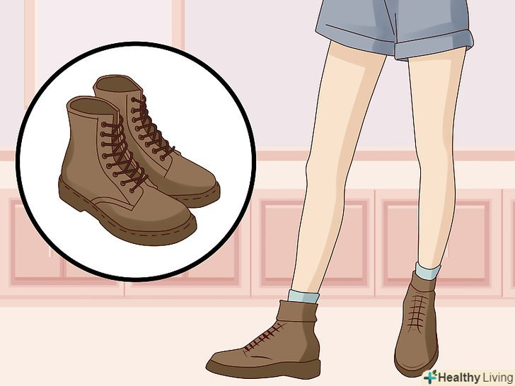 Завершать наряд з 90-х кросівки Kangaroos, черевики Timberland або Dr Martens. Kangaroos — популярний бренд спортивного взуття яскравих забарвлень з крихітними кишеньками на блискавці. Черевики Timberland були дуже популярні у реперів, а взуття Dr Martens, що нагадує армійські черевики, користувалася популярність на гранж-сцені. Ваш вибір взуття буде залежати від того, який з цих стилів вам ближче. [20]- Наприклад, до велосипедкам підійдуть кросівки Kangaroos.