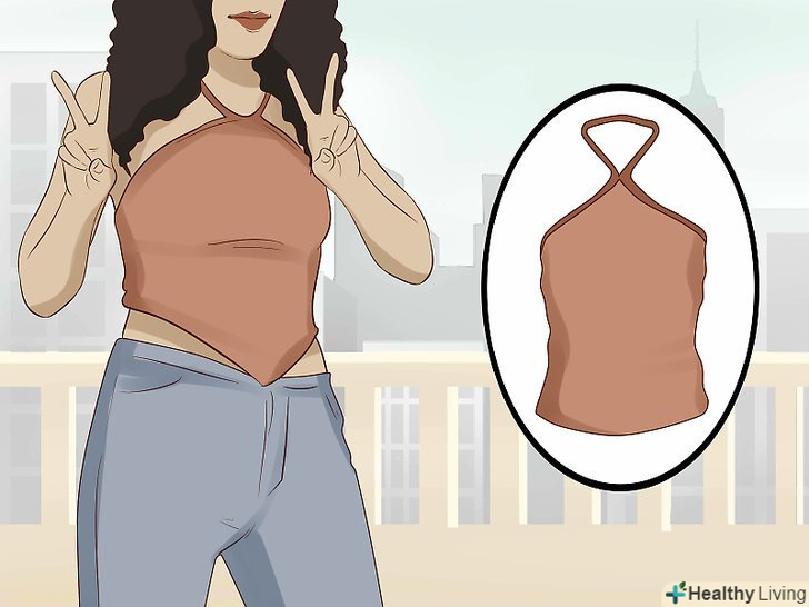 Топ з бандани або облягаючий трикотажний топ. дівчата з 90 - х дуже любили носити топи. Щоб використовувати в якості топа хустку-бандану, складіть її навпіл по діагоналі і прикладіть до грудей. Кінці бандани міцно зав'яжіть на спині вузлом. Замість бандани можна надіти облягаючий топ-трубу. [3]- Топ-труба-це облягаюча коротка майка без рукавів і бретелей.