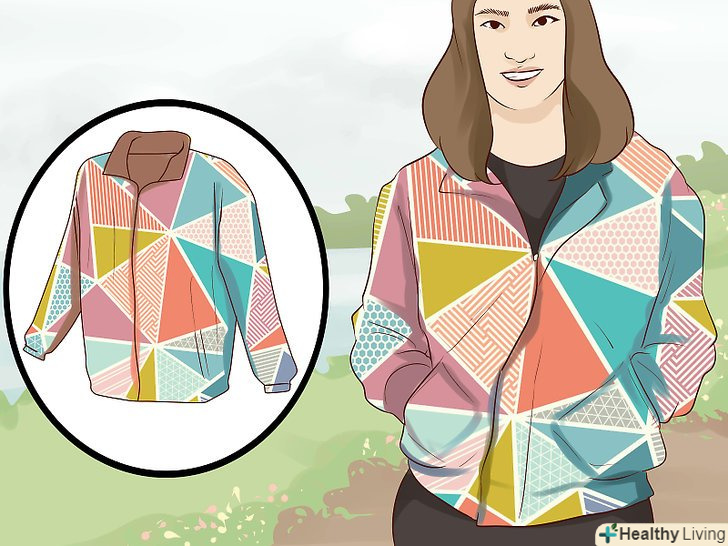 Відмінним доповненням до костюму з 90-х буде вітровка з геометричним візерунком. у 1990-х вітровки користувалися великою популярністю; вони шилися з вітронепроникної тканини різних кольорів, а носити їх можна було з різними нарядами. Одягніть під вітровку футболку; якщо хочете, блискавку можна повністю застебнути. [5]- Вітровка в стилі 90-х, як правило, зшита з тканини декількох кольорів.