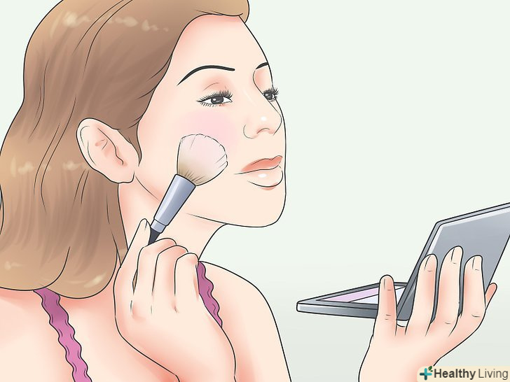 Зробіть макіяж. хоча багато дівчат вважають за краще природний вигляд і відмовляються від косметики, макіяж може стати важливим доповненням образу. Виберіть колір тіней для очей, нанесіть на вилиці рум'яна і зовсім трохи-на губи. Як би ви не одяглися, ви завжди будете виглядати красиво з макіяжем.- Почніть з нанесення основи під макіяж, яка буде відповідати тону вашої шкіри. Це дозволить вирівняти шкіру і приховати її недоліки.