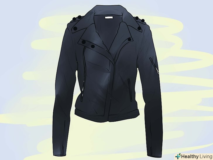 Одягніть шкіряну куртку зверху. Шкіряні куртки ніколи не вийдуть з моди. Шкіряна куртка створить враження жорсткого, незалежної людини, рокера. Вибирайте просту чорну шкіряну куртку і не хвилюйтеся, якщо вона трохи потерта і зношена. [8]