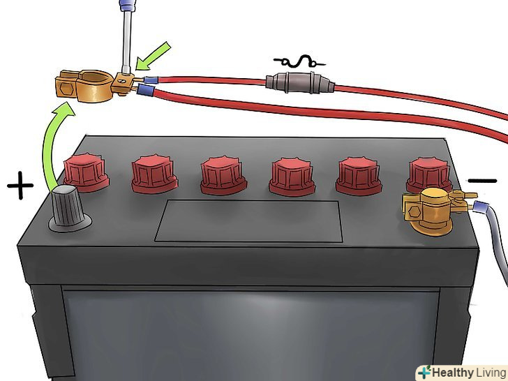 Від'єднайте кабель живлення від акумулятора і приєднайте провід живлення вашого підсилювача до кабелю живлення автомобіля; залиште кабель непідключеним.якщо ви купили комплект, в ньому повинен бути лінійний запобіжник – якщо ні, - вам потрібно його придбати. Відріжте кабель живлення, вставте запобіжник і приєднайте кабель. Сила струму запобіжника повинна відповідати калібру кабелю.