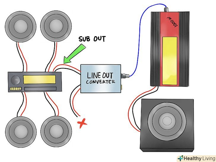 Якщо ви збираєтеся використовувати оригінальну автомагнітолу і підключити підсилювач до неї, вам доведеться купити конвертер виведення звуку за 680 р. в якості конвертера виступає невелика коробочка з двома виходами RCA і 4 проводами для динаміків. Для підключення потрібно витягнути дверний динамік і провести два з чотирьох проводів до нього. Зверніть увагу на позитивні ( + ) і негативні ( - ) клеми. Решта 2 дроти динаміків вам не потрібні, тому приберіть їх з виду і проведіть дроти RCA до підсилювача, підключіть їх в роз'єм «вхід» (IN).