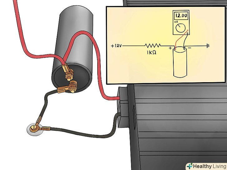 Використовуйте конденсатор для запобігання падінь напруги, викликаних глибоким басом, тобто, моргання лампочок одночасно з ударами ритму.встановіть конденсатор якомога ближче до підсилювача і використовуйте той же заземлення, що і для підсилювача. Перевірте ваш провід живлення і визначте, де буде знаходитися конденсатор, відріжте дріт і прикріпіть кабель акумулятора до акумулятора. Але його не можна просто так підключити, спершу необхідно зарядити його за допомогою резистора. Використовуйте резистори ємністю 1 кОм, тому як вони не сильно гріються. Це займе всього кілька секунд, але не робіть це голими руками. Потім потрібно заземлити конденсатор. Візьміть вольтметр і підключіть його до конденсатора. Візьміть резистор, підключіть його до живиться стороні конденсатора, прикріпивши кабель живлення до іншої сторони резистора. Вольтметр повинен показати близько 12 вольт, що означатиме, що ваш конденсатор заряджений.