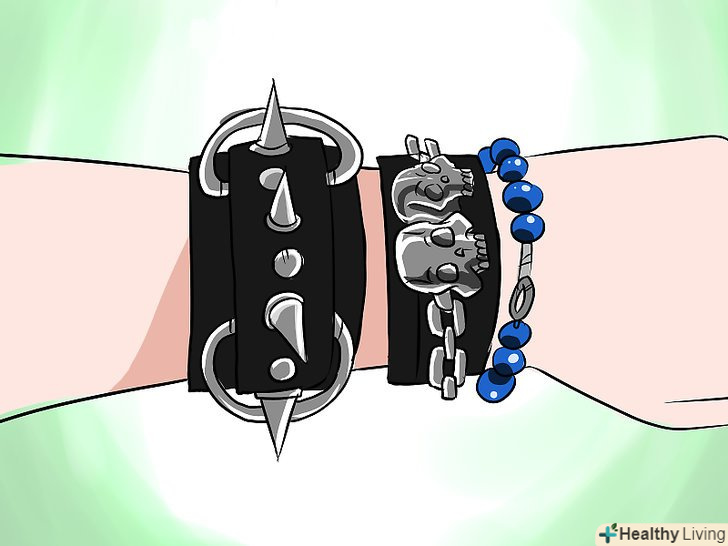 Прикрасьте ювелірними виробами. Заклепки, шипи, черепи, Птахи, сердечка, зірочки, крила – додавайте все, що хочете бачити на своїх прикрасах. При об'єднанні різних деталей одягу для створення прикиду рокерші, колірну гамму повинні складати Чорний, Срібний, Золотий і рожевий кольори або суміш цих кольорів. Одягніть ефектне намисто і сережки з блискавки. На зап'ясті закріпіть намисто з кришок і плетений браслет. [12] отримуйте задоволення, підбираючи елементи одягу під свій наряд.