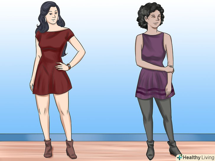 Для найбільш вигідного образу зверніть увагу на сукні довжиною до коліна. відмінно підійде все, що закінчується на середині стегна. Чим коротше плаття, тим довшими будуть здаватися ваші ноги. Довгі сукні (до колін і довше), як правило, не поєднуються з ботильйони, оскільки візуально вкорочують ногу.- Якщо вам потрібно надіти довге плаття, поєднуйте його з непрозорими колготками, відповідними за кольором вашого взуття. Ідеальна комбінацією стануть чорне взуття і чорні колготки. Це зробить ваші ноги візуально довшими.