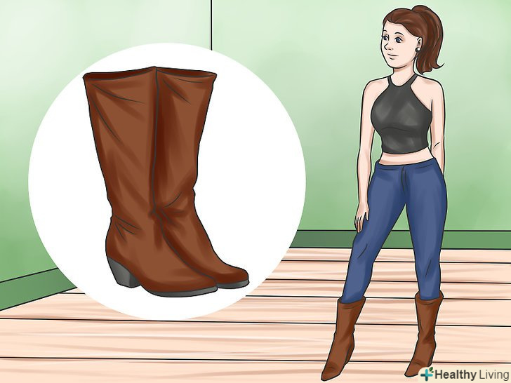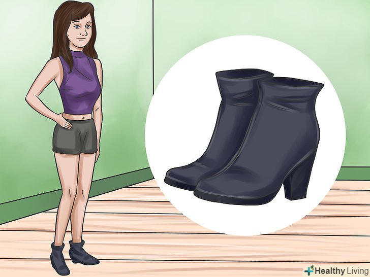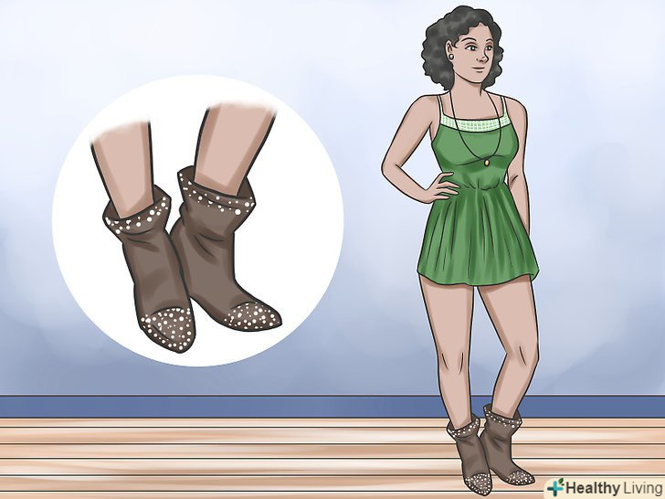 Вибирайте взуття, яка підкреслює достоїнства вашої фігури і візуально подовжує ноги. правильний вибір взуття для певної фігури допоможе збалансувати зростання, вигини тіла або їх відсутність. Нижче перераховані кілька ідей, які засновані на різних розмірах одягу і зростанні: [7]- При низькому зростанні і худорлявому будові тіла вибирайте черевики на підборах, які повністю приховують кісточку. Це подовжить ваші ноги. Намагайтеся не носити короткі ботильйони, халява яких нижче щиколотки.