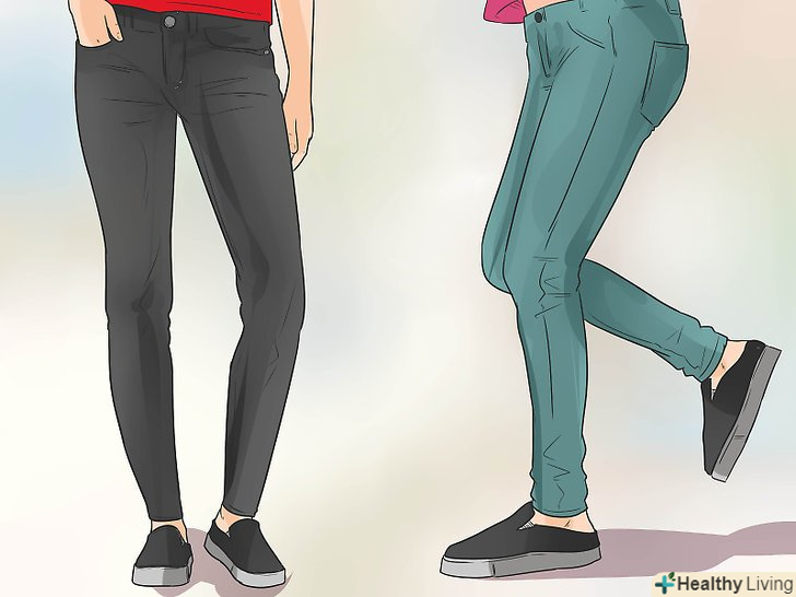 Носіть сині або чорні джинси. «Низ» зазвичай представлений щільно облягаючими джинсами темно-синього або чорного кольору. Часто вони знаходяться на різних етапах зносу, включаючи розрізи, дірки або нашивки з символами і слоганами різних груп. Вибирайте вузькі джинси замість мішкуватих моделей або брюк-кльош. [9]- Також в моді чорні шорти (зазвичай з бічними кишенями), обрізані джинси і шкіряні штани або камуфляжні шорти в стилі мілітарі.