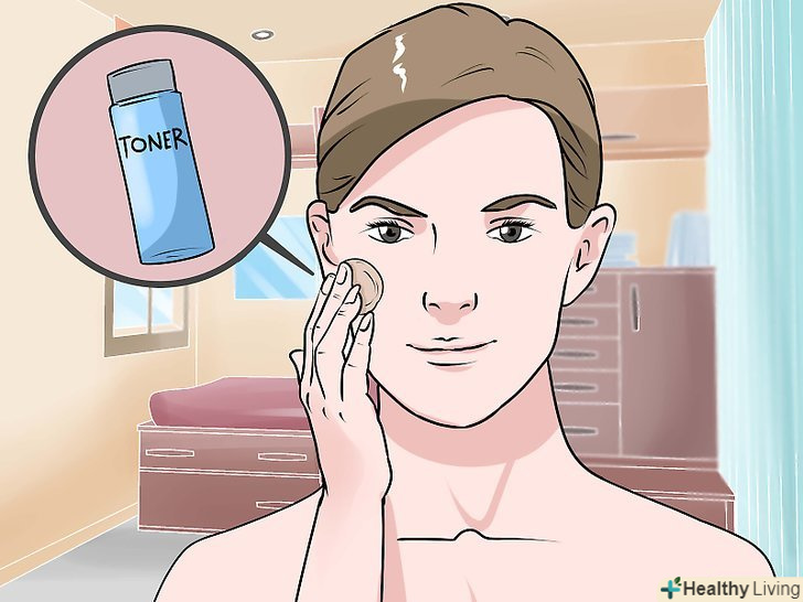 Використовуйте тонік для обличчя, Якщо ви вирішили все ж наносити макіяж. Тонік очистить пори набагато глибше, ніж звичайна вода. [6] він також допоможе звузити пори і зробить шкіру більш гладкою. Нанесіть кілька крапель тоніка на ватний тампон і протріть їм обличчя, особливо дбайливо ставлячись при цьому до зони навколо очей.- Тонік також можна використовувати і чоловікам. Він освіжає шкіру і допомагає запобігти появі прищів і роздратування після гоління. Тільки не використовуйте тонік відразу після гоління, так як в його склад може входити спирт, який буде палити шкіру.