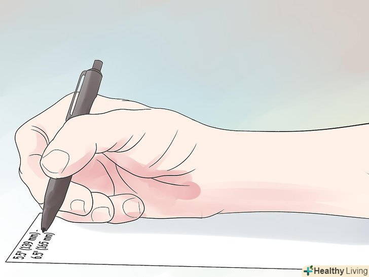 Запишіть окружність зап'ястя. Ви можете використовувати цю мірку, щоб визначити ваш обсяг корпусу, використовуючи наведену нижче таблицю. [1] {/border= " 3 "style=" text-align: center; margin: 1em auto 1em auto;"|+ визначення обсягу корпусу по колу зап'ястя! scope="col" | ! scope= " col | / Маленький об'єм корпусу! scope= " col | / середній об'єм корпусу! scope= " col | / великий об'єм корпусу| - / Жінки 157см і нижче | / lt; 139 мм | / 139 мм - 146 мм / / gt; 146 мм| - / Жінки від 157 см до 165 см | / lt; 152 мм | / 152 мм - 158 мм / / gt; 158 мм| - / Жінки вище 165 см - / lt; 158 мм | / 158 мм - 165 мм / / gt; 165 мм| - / Чоловіки вище 165 см [2] | | 139 мм - 165 мм | | 165 мм - 190 мм | |gt; 190 мм/}