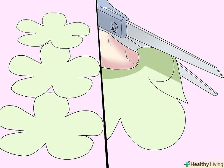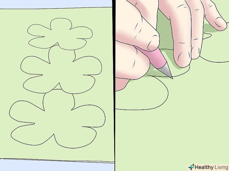 Виріжте з картону три квітки. [3] квіти повинні злегка відрізнятися за розміром. У двох квіток має бути по п'ять пелюсток, а у третього, найбільшого, – шість.- Якщо вам хочеться, пропустіть цей крок і купіть готові тканинні квіти у весільному відділі або магазині матеріалів для рукоділля.