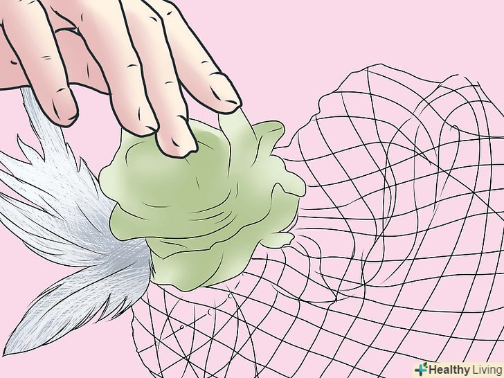 - Декоруйте вуаль пір'ям як самостійними прикрасами. Приклейте їх в розпущеної, напівкруглої композиції, щоб пір'я спадали з вашої голови або красувалися на верхівці. Ви можете залишити їх такими, якими вони є, а можете додати нотку шику, приколів маленьку брошку в точці з'єднання пір'я.