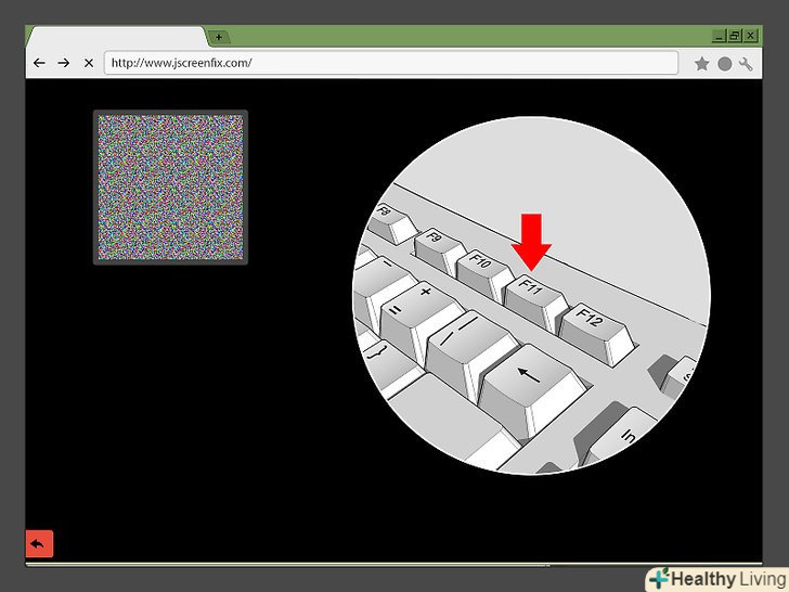 Знайдіть застряглий Піксель.основна частина екрану буде чорною, тому ви без зусиль знайдете застряглий Піксель.- Якщо Піксель розташований не в чорній області вікна програми, натиснітьF11, щоб перейти в повноекранний режим. Можливо, вам доведеться спочатку затиснути клавішу Fn, щоб натиснути на F11, якщо браузер не перейде в повноекранний режим, коли ви натиснете F11.