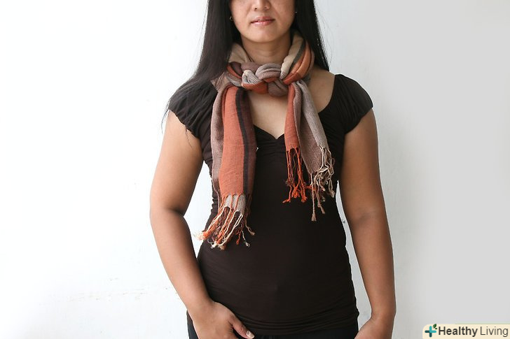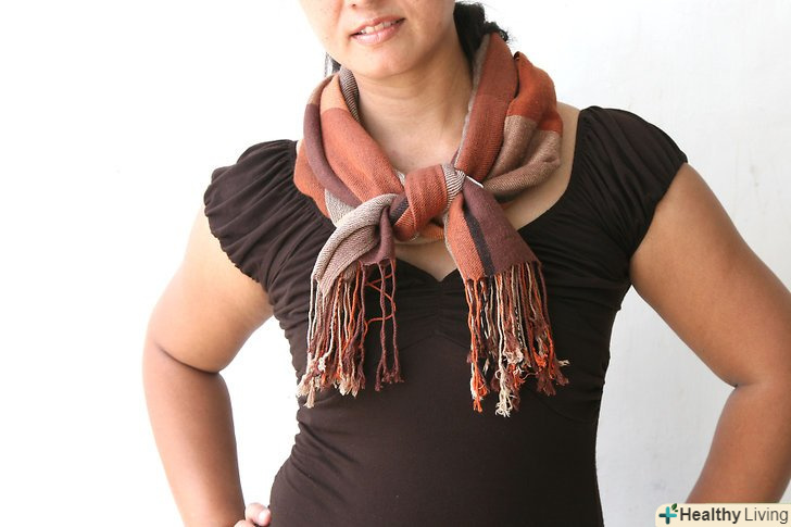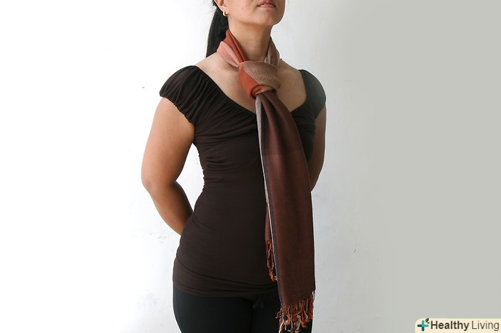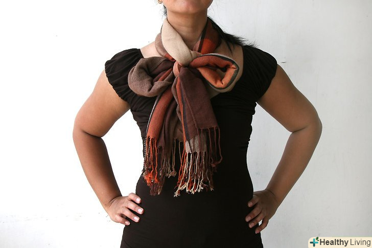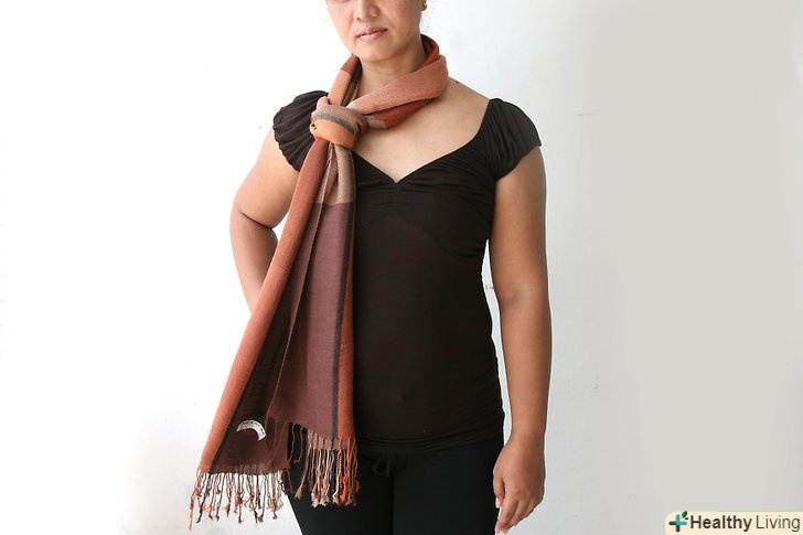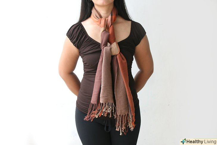 Плетіння у вигляді нескінченності. Зв'яжіть два кінці пашміни так, щоб вийшла петля. Якщо у Вашого шарфа є бахрома, частинами зв'яжіть її між собою подвійними вузлами. Якщо бахроми немає, то використовуйте кути прямокутника; зв'яжіть два вузла в двох місцях, де кути стикаються. Потім розташуйте велику петлю навколо шиї так, щоб вузли знаходилися уздовж лінії волосся. Подвійте петлю по колу вільними краями шарфа, щоб нічого не висіло. Щоб шарф вийшов більш затягнутим, можете потроїти петлю. [2]