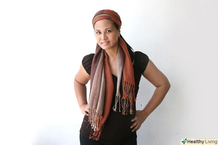 Робимо косинку на голову. скрутіть ваш шарф по всій довжині в не дуже широкий джгут. Оберніть їм голову трохи вище лінії волосся так, щоб вільні краї спадали по вашій спині. Потім зав'яжіть шарф тугим вузлом на потилиці. Оберніть краї шарфа навколо голови по лінії волосся, а залишилися краю заправте під петлю навколо вашої голови.