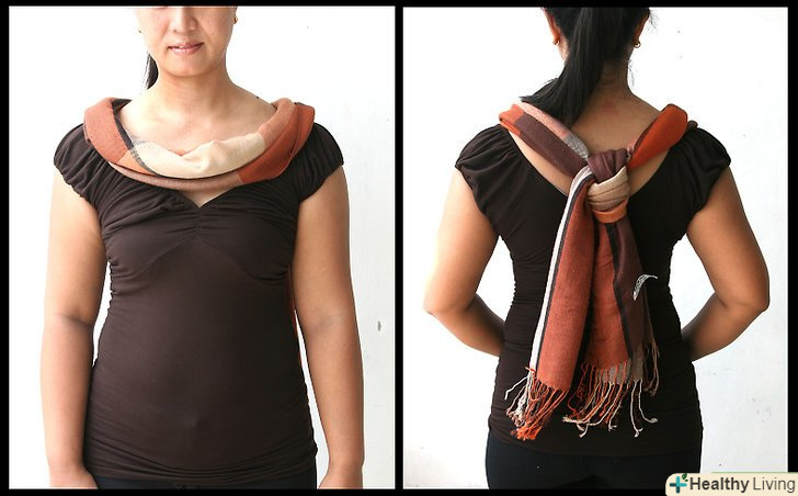 Зав'язуємо шарф за принципом бандани. повісьте шарф на шию так, щоб обидва вільних краю по плечах спадали на спину. Потім переплетіть хвости так, щоб вільні краї звисали на грудях. Зв'яжіть їх тугим подвійним вузлом і розправте тканину.