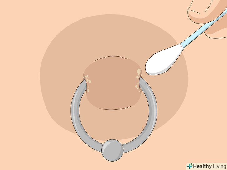 Видаляйте утворюється кірку. якщо навколо пірсингу утворюється струп, постарайтеся обережно його прибрати. Краще робити це в душі, так як розм'яклий струп простіше видалити. Пальцем або ватною паличкою обережно видаліть струп з проколу. [1]- Коли будете видаляти струп, постарайтеся не повертати кільце занадто сильно. Чи не провертайте кільце повністю, а лише настільки, щоб прибрати струп.