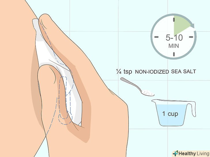 Приготуйте розчин з морської солі. насипте ¼ чайної ложки нейодованої морської солі в склянку (240 мл) теплої дистильованої води. Перемішайте, щоб сіль розчинилася у воді. Візьміть паперовий рушник, змочіть його в розчині і прикладіть до соска на 5-10 хвилин. Повторюйте процедуру кожен день, поки Область пірсингу не заживе. [2]- Можна спробувати перевернути склянку з сольовим розчином і поставити його на сосок, щоб над водою в склянці утворився вакуум. Потім ляжте на спину і почекайте, поки сосок буде відмокати в рідині. Тільки дивіться, не пролийте воду.