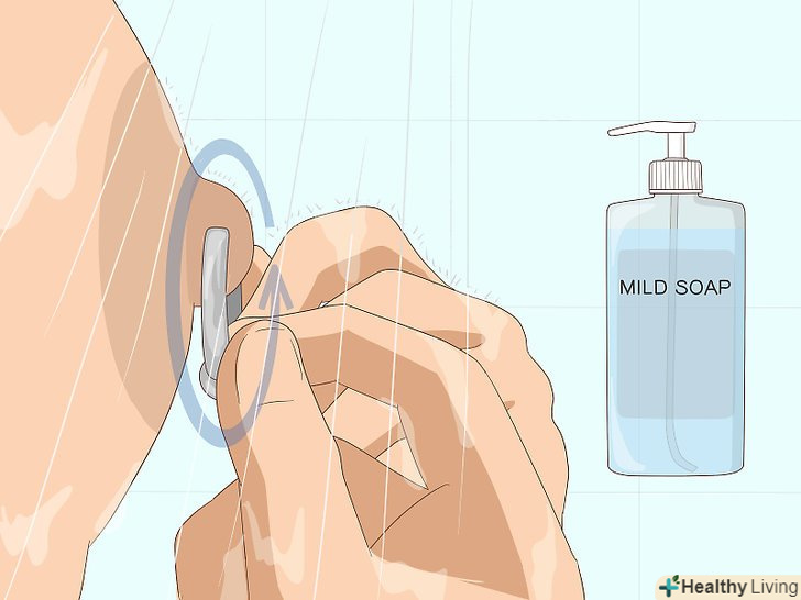 Приймаючи душ, користуйтеся м'яким милом. при кожному прийомі душу мийте Пірсинг ніжним рідким милом. Видавіть на пальці трохи мила і обережно втирайте його в Пірсинг, повільно повертаючи кільце (або зрушуючи штангу). Обов'язково змийте всю піну, інакше залишки мила можуть викликати роздратування. [4]- Не користуйтеся милом з запахом, барвниками або іншими добавками, які можуть привести до подразнення області проколу.