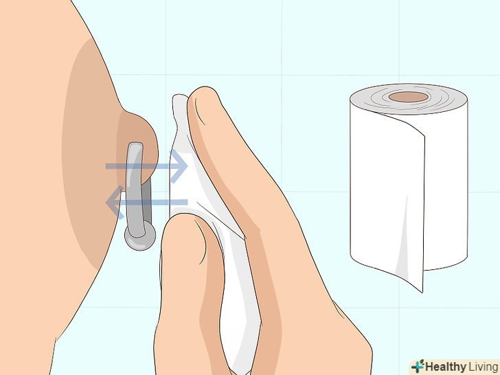 Насухо промакивайте Пірсинг. після душу промакивайте область пірсингу паперовими рушниками. Якщо ви залишите прокол мокрим, то створите ідеальні умови для росту бактерій, особливо якщо надягнете щільно прилеглу одяг. Перш ніж одягнутися, переконайтеся, що область пірсингу повністю висохла. [5]- Кожен раз насухо промакивайте Пірсинг одноразовими паперовими рушниками. Тканинний рушник може бути розсадником бактерій, тому не використовуйте його, щоб не занести інфекцію.