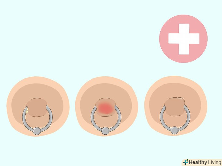 Проконсультуйтеся з лікарем, якщо помітите симптоми інфекції. у разі інфекції якомога швидше зверніться за медичною допомогою. Зараження соска може доставити чимало проблем вам і Вашому тілу. Остерігайтеся наступних симптомів: [6]- Зелений або жовтий гній, що випливає з проколу;