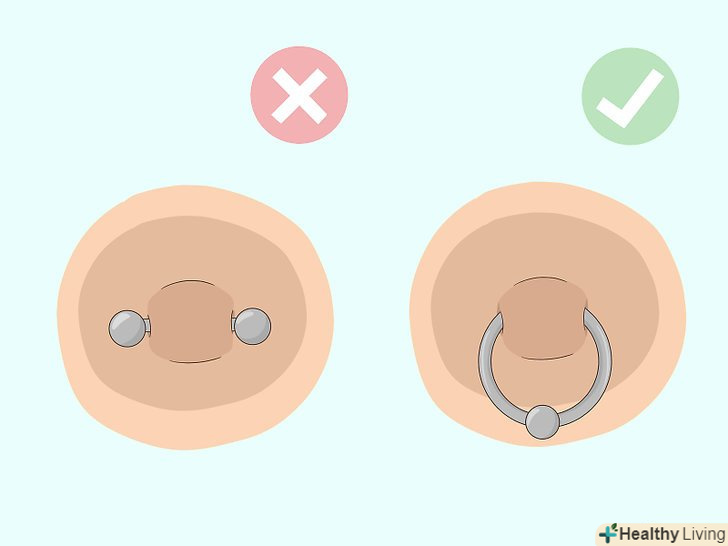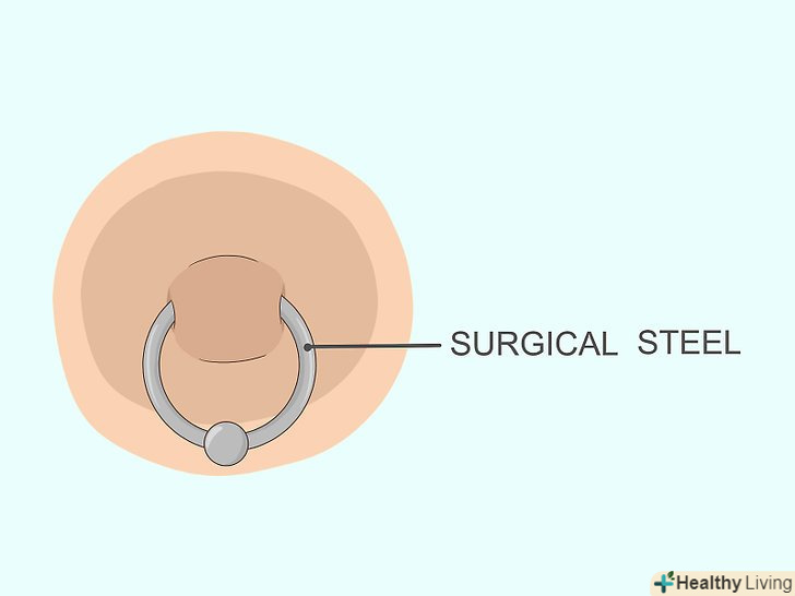 Виберіть хірургічну сталь. якщо вам вперше роблять пірсинг, дуже важливо, щоб прикраса було виготовлено з стерильної хірургічної сталі. Це допоможе запобігти зараженню і прискорить загоєння проколу. Оскільки сосок вкрай чутливий, за ним потрібно правильно доглядати. [8]- Прикраси з інших матеріалів можуть викликати роздратування і навіть інфекцію.
