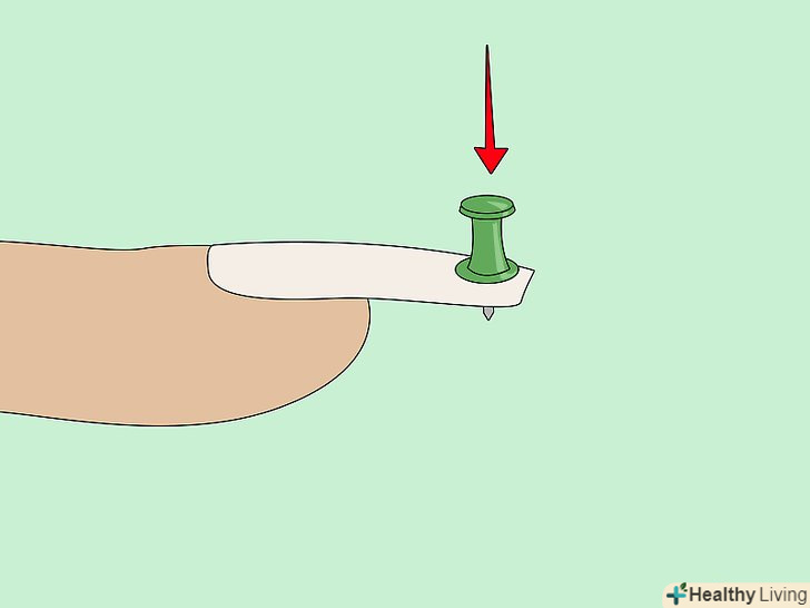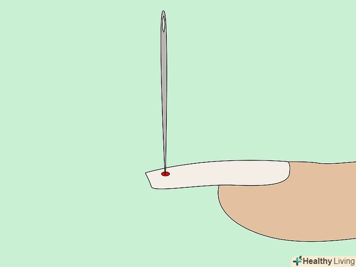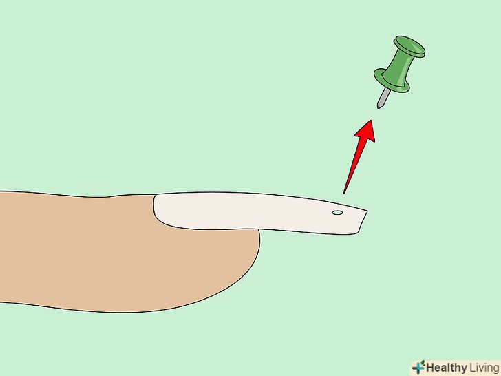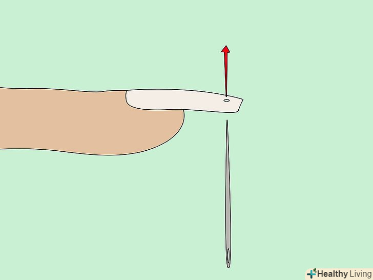 Притисніть голку до нігтя. почніть з боку, яку ви зазвичай не покриваєте лаком (якщо ви фарбуєте нігті); це убезпечить вас від випадкового пошкодження пальця голкою. Переконайтеся, що проколюєте не менше ніж на відстані 1 мм від кінчика нігтя, так ваш ніготь не трісне.