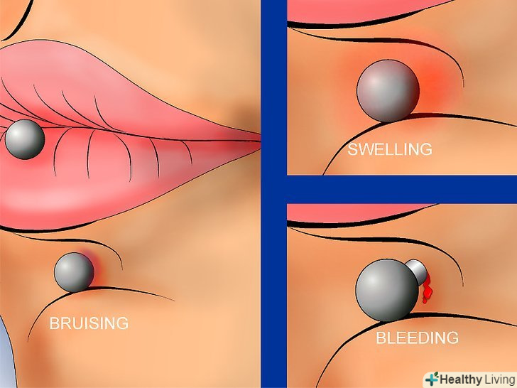 Дізнайтеся про ознаки нормального загоєння. це добре-бути обережним, але все ж краще знати ознаки нормального загоєння, і тоді вам не доведеться занадто часто чистити ваш пірсинг, весь час думаючи про інфекцію. Ось кілька симптомів, які є частиною нормального процесу загоєння:- Невеликі кровотечі і набрякання. Будьте готові до того, що з'явиться невелика кровотеча і пухлина відразу після того, як ви зробите Пірсинг. Також можуть з'явитися синці, і ви відчуєте слабкість. Ці кілька речей є нормальною реакцією, але якщо це відбувається довше тижня з того моменту, як ви зробили Пірсинг, то зверніться до вашого майстра (майте на увазі, що пірсинг статевих органах може рясно кровоточити перших кілька днів).
