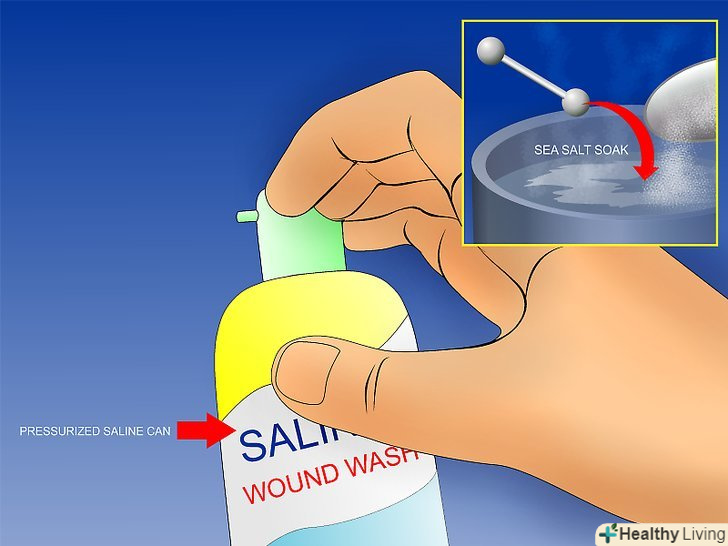 - Якщо ви не можете придбати сольовий розчин, зробити свій власний. Замочіть пірсинг в теплою водою і нейодированной морської солі, морська сіль без йоду зазвичай додається в якості доповнення. Ваш майстер повинен дати вам трохи, але він також доступний у більшості продуктових магазинів. Не більше ніж щіпку на 250 мл. води; суміші можуть пересушити свіжий Пірсинг.