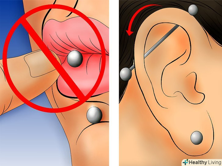 - Ніколи не прокручуйте вашу сережку. Шкіра, що прилипла до неї - це нормально під час початкової стадії загоєння. Прокручуючи сережку, ви насильно відокремлюєте шкіру від неї, завдаючи травми і, швидше за все, ще більше продовжите процес загоєння.
