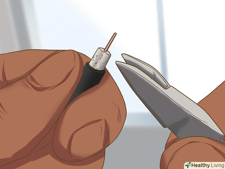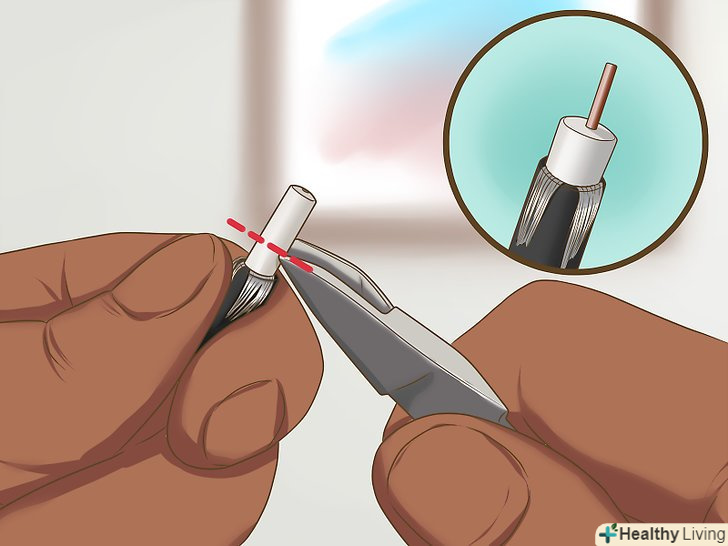 Обріжте (зазвичай білий, але може бути і прозорим) діелектричний пластик з внутрішньої жили кабелю.- Ні в якому разі не подряпайте і не надріжте центральний провідник. Будь-яке пошкодження цього провідника може значно позначитися на сигналі.