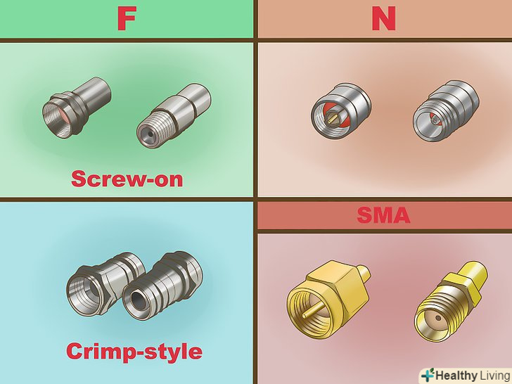 Виберіть правильні роз'єми.більшість роз'ємів для установки домашнього відео мають роз'єми F-типу. Однак, можливо, що ваша система використовує роз'єми N-типу.- Врахуйте, що є кілька типів F-роз'ємів для кабелю RG-6, в основному це гвинтові і обтискні роз'єми.