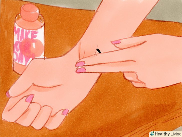 Приховайте татуювання за допомогою косметики. як тільки ваша татуювання повністю заживе, ви зможете приховувати її за допомогою косметики. Існують якісні косметичні засоби спеціально для цієї мети, і вони дійсно допомагають. Багато засобів досить стійкі, тримаються весь день і можуть навіть бути водонепроникними. [14]- В крайньому випадку, для приховування татуювання можна використовувати бліду фарбу для обличчя. Нанесіть два шари поверх татуювання (даючи висихати кожному шару), потім покрийте рідкої тональної основою під колір вашої шкіри. Лак для волосся допоможе закріпити результат. [15]