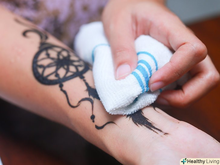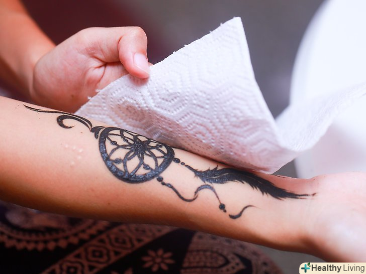 Змийте надлишки сухої хни. зробіть це за допомогою теплої води, м'якої тканини і делікатного мила. Промокніть малюнок м'якою вологою тканиною. Якщо ви будете терти малюнок, він швидше потьмяніє.