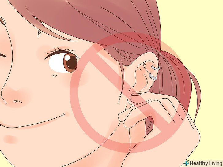 Не торкайтеся до вуха і місця пірсингу без особливої необхідності. якщо вам не потрібно очистити рану або вийняти сережку, не торкайтеся до вуха. Крім того, стежте, щоб вуха не торкалася одяг і різні аксесуари. [15]- Не носіть навушники до тих пір, поки не пройде інфекція.