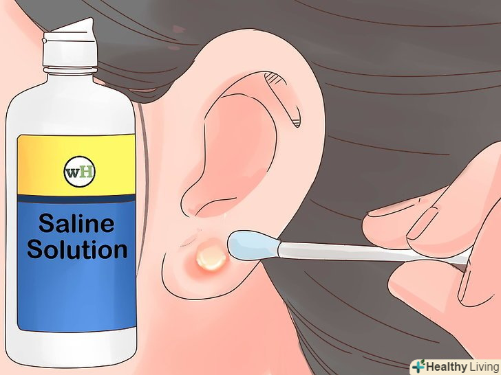 Промивайте уражене інфекцією місце сольовим розчином. щоб приготувати сольовий розчин, розчиніть 1/2 чайної ложки (3 грами) солі в 1 склянці (240 мілілітрах) теплої води. Змочіть в розчині стерильний ватяну кульку або бинт і обережно витріть їм вухо в місці пірсингу з обох сторін. Робіть це двічі на день, щоб рана залишалася чистою. [11]- Промивання сольовим розчином може викликати легке пощипування. Тим не менш, це не повинно бути боляче. Якщо ви відчуваєте біль, проконсультуйтеся з лікарем.
